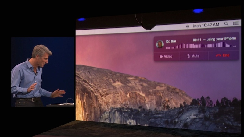 Yosemite 甚至可以直接在 Mac 電腦上接聽電話,Craig Federighi 現場立即播打給才剛成為合作夥伴的 Beats 創辦人 Dr.Dre 與他通話;而在 Safari 上查詢店家電話時,也能一鍵撥號,更是便利。