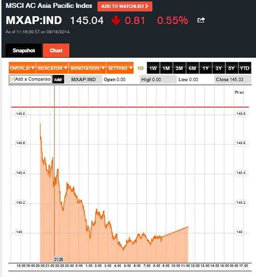 即將到來的美聯儲決議可能進一步加強市場對於美國的加息預期,風險資產因此遭到拋售。截止到北京時間2:39分,MSCI亞太指數下跌0.55%至145.04,持續下跌九個交易日,為2002年6月以來最長。權重股中移動下跌3.7%嚴重拖累指數,Ramsay Health Care則下跌3.4%,軟銀則在阿里巴巴IPO的推動下逆勢上揚3.6%。