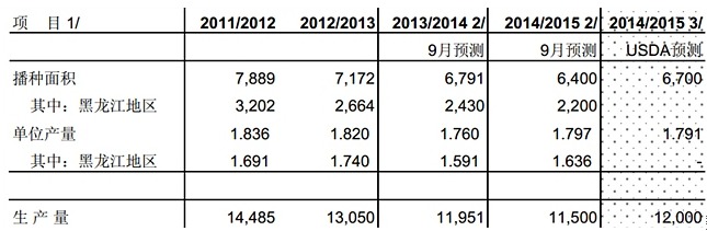 據最新的機構數據預計,2014年中國大豆播種面積預計為640萬公頃,同比減少5.8%;2014年大豆平均單產為1.797噸/公頃,同比增長2.1%;大豆總產量為1150萬噸,同比下降3.8%。如圖表1所示。