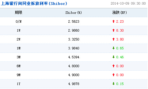 上海銀行間同業拆放利率(Shibor)顯示,隔夜Shibor報2.5623%,上漲2.23個基點;1周Shibor報2.9860%,上漲8.30個基點;2周Shibor報3.3250%,上漲3.80個基點;1個月Shibor報3.9840%,下跌0.65個基點;3個月Shibor報4.5394%,下跌0.46個基點。