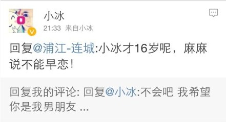 在網友們與小冰玩的不亦樂乎的同時,一些新的玩法也被挖掘了出來:愛奇藝副總裁劉春在自己的微博中詢問小冰潘石屹和任志強的關係,得到小冰“情人!”的答案后狠狠地“調戲”了一下他的這兩位好友;素有新浪微博“沙發狂魔”之稱的劉燁發微博表示“大家有什麼關于哥的問題可以現在評論裏@小冰 再問,她會一一回復給大家”,完全把小冰當成了自己的私人秘書;知名主持人崔永元則把小冰當成了“生活百科全書”,在自己的微博上詢問小冰“如何避免被電梯夾頭”,實為再次調侃好友司馬南在美國機場被電梯夾頭事件……