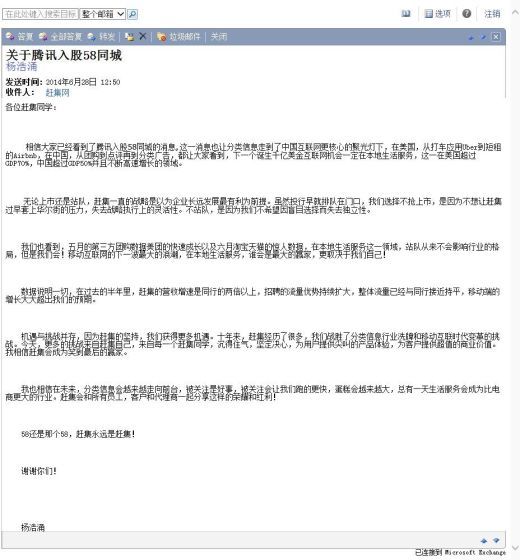 趕集網楊浩湧內部郵件評騰訊58“閃婚”