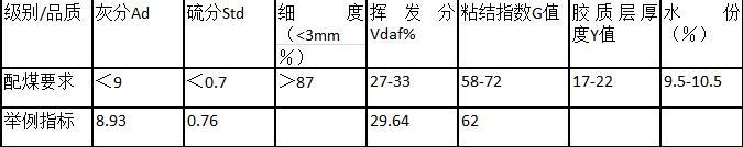 試設定配煤比(%):1/3jm : qm : fm : psm=40:15:20:25,配合煤的質量指標的計算結果如下: