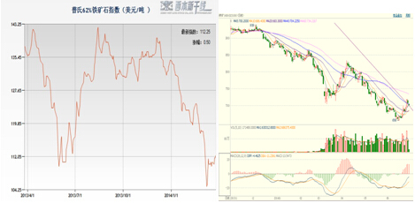 附圖2、圖3:鐵礦石普氏指數走勢圖,大商所i1405合約k線圖(截至2014年6月30日)