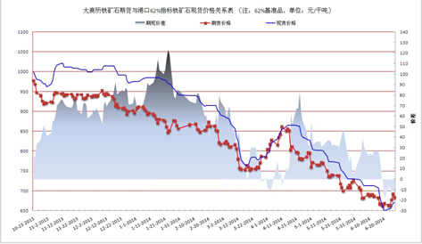 價差關係:最新鐵礦石期貨現貨價差走勢圖(截至2014年6月27日)