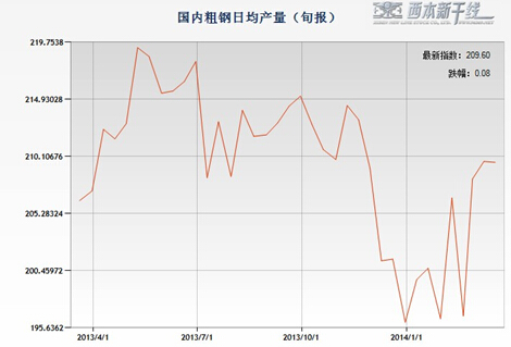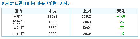 截至2014年6月27日,國內粗鋼產量日均產能較之前期有所降低,對鐵礦石消費構成壓制。