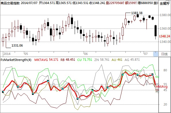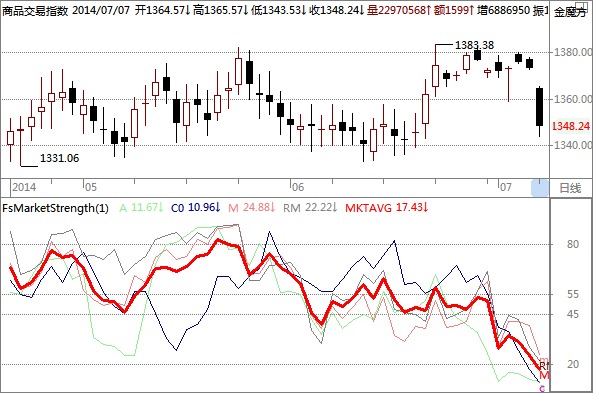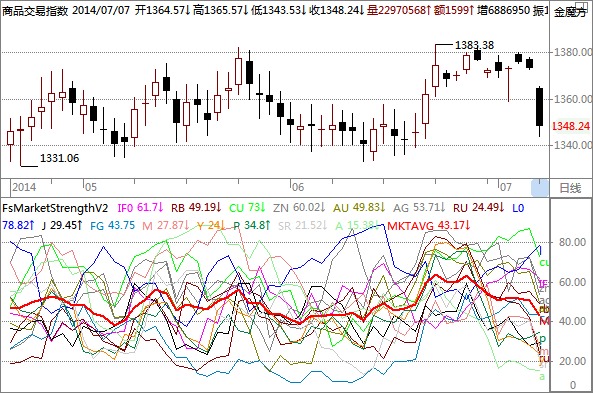 和訊期貨市場生態圖-市場相對強弱顯示,從6月27日開始,市場已經脫離偏多的軌道,相對強弱均值開始逐漸下移。盡管和訊商品指數重心仍在區間上沿整理,但是各品種的多空強弱已經出現較明顯的分歧,今天大宗商品的普跌打破了整理的狀態,市場相對強弱均值也延續了下跌狀態,目前全市場mrs均值為43.17,屬於弱空狀態。