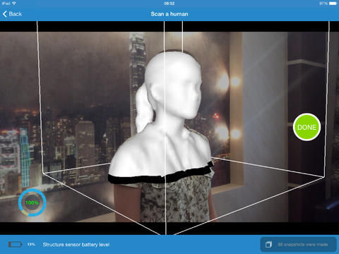 這款名為itSeez3D的應用目前在App Store限時免費。該應用利用連接至iPad的Structure Sensor感測器來獲取物體或人體的3D結構及表面色。隨后,這款應用會將獲取的數據上傳至雲計算平台,進行進一步處理,並“在幾分鐘時間內完成3D建模”。用戶可以獲得標準的.ply或.obj格式的3D模型檔案,隨后可以將這些檔案導入CAD軟件,或發送至3D打印機進行製作。