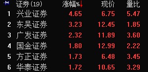和訊股票訊 券商股盤中出現拉升,其中興業證券(601377,股吧)漲幅近5%,截止發稿,該股漲幅4.65,報6.75元。