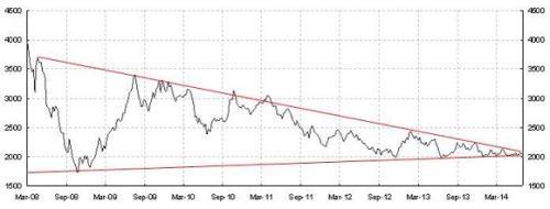 在股市分析的技術派看來,如果連接上證綜指自2007年以來的各個階段性的頂部(如圖),上證綜指呈現出一個巨大的楔形走勢,同時這個楔形走勢更不斷收窄。一些技術分析師認為,這種技術形態預示大牛市馬上就要來臨了,但我並不太認同這種觀點。楔形走勢,不論其大小,只是一種延續的形態,反映市場可能會持續相關走勢,直到市場最終向上或向下突破楔形走勢為止。而市場的最終去向還是取決於經濟的基本面。