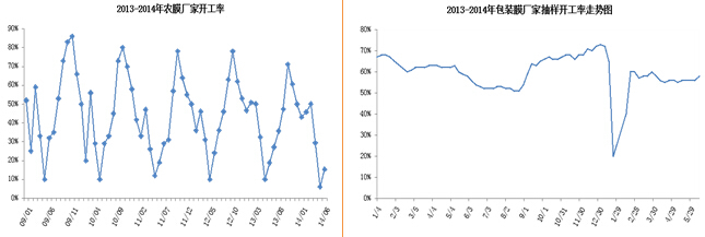從農膜廠家的歷史開工率來看,開工率在5、6兩月跌至全年低位,進入7月份之后逐漸好轉,之后開工率便會一路回升並在10月份達到全年最高水平。短期內由於原料價格和訂單數量的原因導致農膜廠商整體開機率偏低,農膜廠商堅持根據定單進行采購,整體庫存偏低,未來開機率回升后或將拉動下游農膜企業對原料的采購需求。至於包裝膜廠家,根據歷史抽樣統計數據情況來看,未來開工率回升的可能性還是很大,並且當前包裝膜廠商的庫存低,短期內大多都有補庫的需求。因此整體看來,雖然原料價格對下游備貨積極性進行了打壓,但是未來剛性需求的回升仍會成為塑料期價和市價的一個有力支撐。