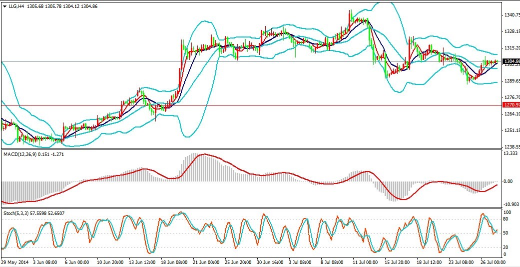 國際黃金技術面分析,在現貨黃金4小時圖中黃金價格微幅上揚。boll軌收口水平運行,國際金價運行在boll中軌在線方。均線方面,5日均線水平運行,金價圍繞5日均線震盪。指標macd向上運行,空頭動能小幅縮減;stoch指標雙線形成小金叉。