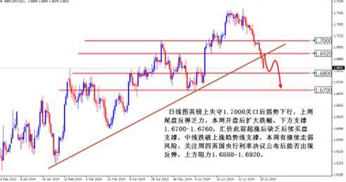 周五(8月1日)公布的調查顯示,英國7月制造業活動擴張速度為一年來最慢,或反映出英國升息前景和烏克蘭危機升級的影響。具體數據顯示,英國7月制造業采購經理人指數(pmi)指數降至55.4,為2013年7月以來最低,不及預期的57.2,前值57.5。上周公布的英國經濟指標繼續回落,此前英國7月nationwide房價年率與月率雙雙不及預期和前值,房價月率僅上漲0.1%,創自去年4月以來最小漲幅,表明英國樓市開始降溫。投資者看好英國央行提前加息的意愿進一步減弱,英鎊多頭加速撤離導致匯價上周大幅下行,目前英鎊兌美元已跌至1.6800一線,且上周尾盤並未趁美元回落展開反彈,相比其他非美貨幣英鎊短線走勢較弱。