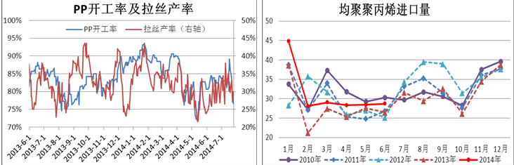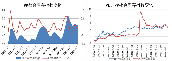 2014年1-6月份國內pp總供應量同比增長1%,pp需求同比增速在5-7%之間,供應並未明顯增加,但需求保持中等增速,因此,上半年pp是去庫存格局,目前整個社會庫存在低位。8月份開始,檢修裝置重啟、新增產能釋放、進口季節性增量會使國內供應量迅速回升,但新增煤化工產能能否形成穩定供應還有較大不確定性;需求以季節性的增量為主;上游石化庫存壓力不大,中間環節庫存不高,下游庫存在相對低位。