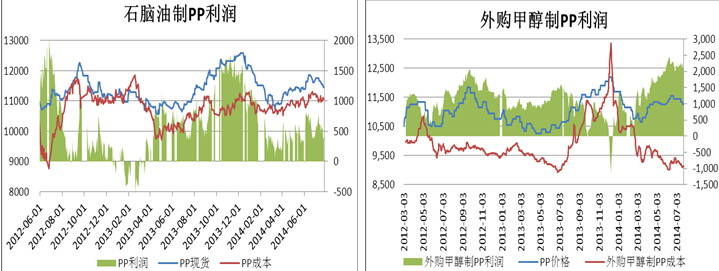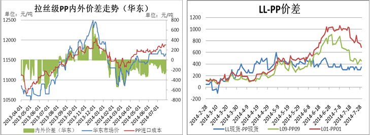 7月份,pp進口虧損幅度有所擴大,目前,進口虧損200元/噸左右;lldpe-7042、pp-t30s現貨價差350元/噸,在近兩年的高位,l1409、pp1409合約價差455元/噸,l1501、pp1501合約價差688元/噸。