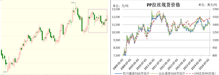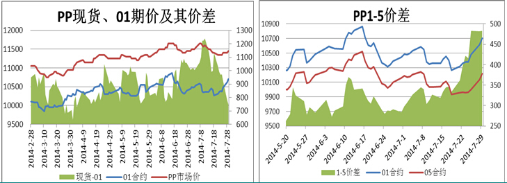 6月底開始,雖然pp社會庫存很低,pp現貨市場價較為強勢,但由於國內幾套新裝置開始陸續試車,新增產能投產預計使pp期貨漲幅不及現貨,期貨貼水幅度擴大;隨后神華開始下調競拍價,中油、中石化跟隨,pp期現貨重心開始下移,至7月下旬開始企穩。截止7月25日,pp1409合約收至11248元/噸,小幅貼水低階現貨;pp1501合約收至10481元/噸,貼水現貨820元/噸。