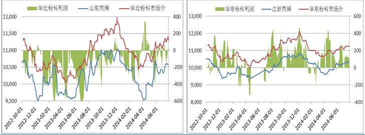 目前華東外購丙烯制pp粉料有利潤,華北外購丙烯制pp粉料在盈虧平衡線附近;一體化的石腦油制pp利潤400元/噸左右,處於中等偏低水平;外購甲醇制pp利潤豐厚。