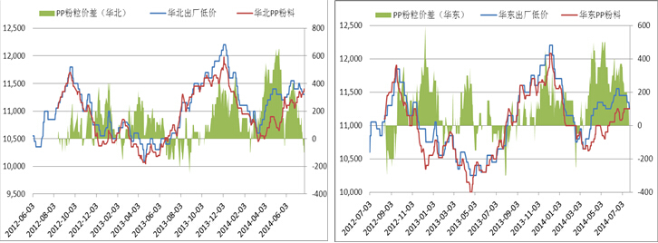 7月份,pp粒料和pp粉料價差縮小,目前華北粒料-粉料價差-100左右,華東粒料-粉料價差0,從價差來看,粉料對粒料有一定的替代性;共丙和拉絲價差仍然在較高位。