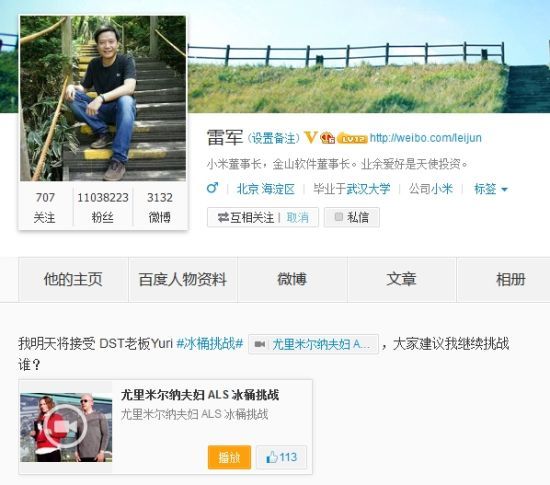 小米董事長雷軍昨天下午通過微博表示,已經接受DST老闆Yuri對他的挑戰,並將於今天完成整個冰桶挑戰。