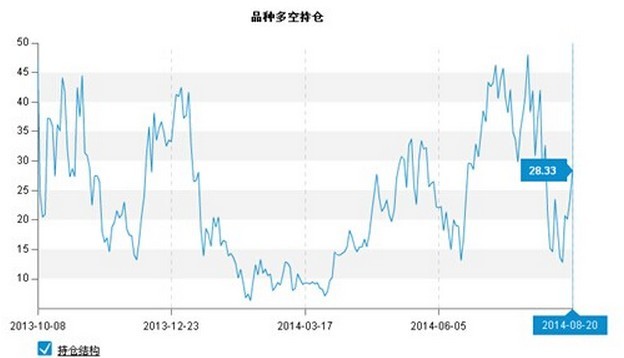 圖2可以看出:整體上大賽選手銅投機性持倉比例基本處於空頭狀態。今年7月中旬,銅投機性持倉持續震盪下跌至10%附近,隨后反彈但未突破50%上方。8月20號這一交易日,大賽選手銅投機性持倉比為28.33%,空方占優。
