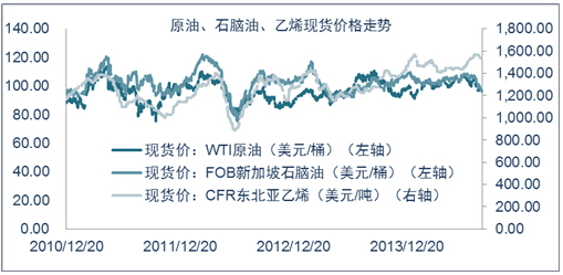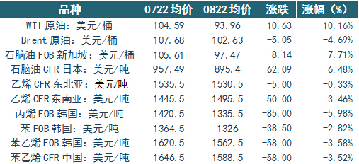 上游原料之間價格分歧明顯,原油持續走弱,而石腦油與乙烯價格偏強