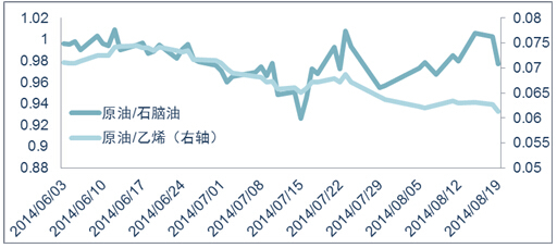 本月原油價格由於供應充足,世界經濟復甦不及預期等原因單邊下行。石腦油跟跌,然而由於原材料的價格變動傳導到成品需要時間,乙烯價格並沒有明顯的變動,石油與乙烯的比價已由6月3日的0.071下降到8月20日的0.061,下降了14%。自2010年12月以來,原油/乙烯的比價基本位於0,06與0.1之間,中值為0.08,最低點出現在2014年1月7日,為0.0584,且每次比價小於0.065時,均在一個月內回升至0.065以上,現在的原油/乙烯比價為自2010年12月以來的次低點。按照歷史數據發展規律推斷,原油/乙烯比價近期大概率會回升,即如下月原油期貨沒有大幅反彈且持續低位震盪,則預計近期乙烯會有一輪下調行情(僅供參考)。