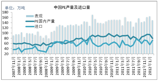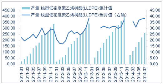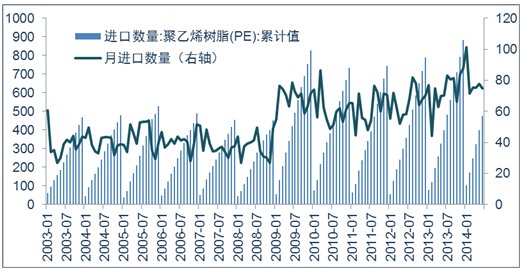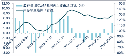 生產與進口方面,我國lldpe產量穩步增長,lldpe產能維持在每月30-40萬噸。pe進口量維持在80萬噸左右。各企業開工情況正常。庫存方面,以去年8月16日為基期,我國的pe國內主要市場庫存震盪上行,至2014年8月16日,我國庫存總量已上升至去年同期的128%。