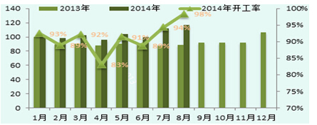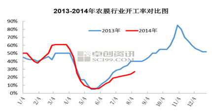 lldpe消費領域,農膜和塑料薄膜是塑料下游需求端的消費大戶,進入8月份,在漸入我國聚乙烯傳統旺季之時,聚乙烯市場價格持續下滑,農膜生產企業開工率與7月份相比有明顯回升,但較去年同期明顯偏低。目前整體開工率在27%左右,同比去年減少13%。原因主要在於pe價格較往年同期偏高,加之下游訂單較往年偏差,儲備階段拉長,均抑制了對原料的需求。隨著農膜需求旺季的臨近,8月底農膜訂單或將繼續好轉,逐步由儲備期向生產旺季過渡,后期對原料需求將進一步增加。而作為lldpe下游消費主體的包裝膜方面,整體開工率依然維持在65%左右,由於這部分需求以剛性為主,所以開工情況與7月基本持平。目前石化企業總體裝置開工率在83%左右,加上煤制產品的沖擊,市場供需失衡狀況明顯,這也導致石化庫存大幅攀升,進一步增加了lldpe價格下行壓力。