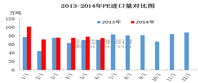 截止2014年6月,pe進口總量達到475.76萬噸,同比去年增長19.35%。2014年在春節因素淡去之后,進入3月份,進口量一直維持在75萬噸左右,相比去年,進口量整體處於較高水平。近期國內市場持續下行,而進口料成本較高,內外貿倒掛現象有增無減,其中lldpe價差達500元/噸以上。在這種高成本、銷售緩慢的情況下,貨源或將進一步積累,至此7月份港口庫存將繼續增加。