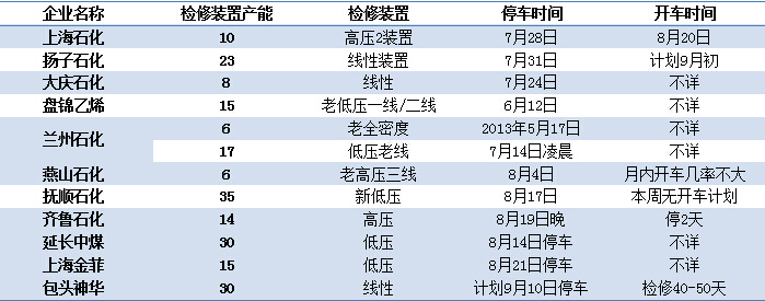除了新增產能投放外,7-8月份裝置開工率也大幅提高,僅個別小裝置停產檢修。揚子石化、包頭神華兩套較大型的lldpe裝置紛紛延遲檢修期,裝置檢修推遲,供應量增加較為明顯,庫存開始累積。8月下旬起,裝置檢修略有增加,齊魯石化、延長中煤等都已停車檢修,包頭神華30萬噸的煤制烯烴裝置,計劃9月10起檢修,檢修期40-50天。總體來看,8-9月份供應增量仍較大,但包頭神華煤制烯烴裝置檢修將減少市場低價貨源供應。
