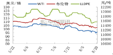 6月份,伊拉克和烏克蘭危機以及隨后以色列和巴勒斯坦在加沙地帶武裝衝突推高了石油市場價格,然而全球石油供應並沒有受到影響,美國石油協會表示,美國7月石油需求創下四年內同期最高數據。與此同時,原油產量持續成長,觸及28年內同期最高,原油進口因而降至19年低點。美國原油期貨因供應增加而走低,加之利比亞原油產量增加,伊拉克政府軍與庫爾德武裝從極端組織手中奪回摩蘇爾大壩打壓油價。自今年6月中旬,brent和wti近月合約達到年度高點115美元/桶和107美元/桶以來,油價一路下跌,截至8月中旬,brent和wti近
