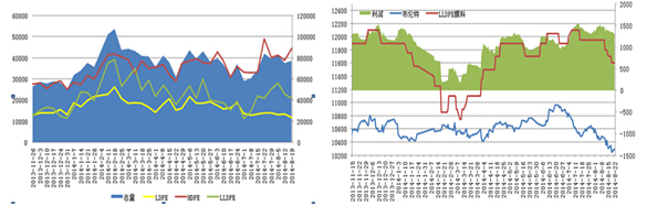 2014年一季度,石化庫存過高、市場價格偏離市場承受能力,價格震盪下行;二季度,原油一路上行,石化企業檢修並限產保價,下游淡季不淡,市場需求維持剛性,驅動塑料價格大幅上漲;然7月中下旬開始,塑料跌破上升趨勢線,開啟了塑料市場價格回落的序幕。造成本輪價格回落主要有以下幾方面因素:一方面,煤化工裝置如期投產,對塑料市場沖擊超出預期,盡管需求臨近旺季,但下游消費萎縮,備貨熱情降低;另一方面,石化出廠價不斷下調,裝置檢修減少,包頭神華一再推遲檢修,供應較之前寬鬆,庫存開始累積。總的來說,lldpe供應結構的改變,導致市場觀望情緒加重。