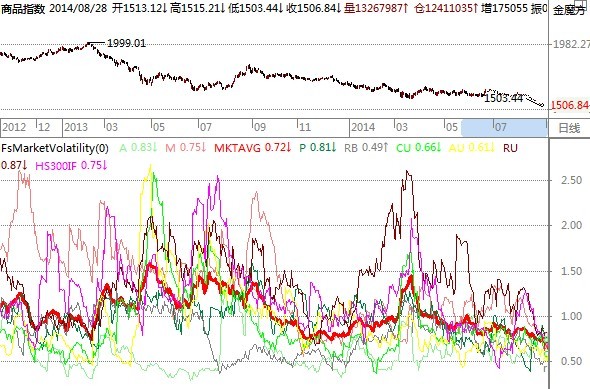 和訊期貨市場波動率(mvi)統計的15個具有代表性的品種波動率圖表顯示,今年的市場波動率相較往年明顯偏低。2011年日均波動率為1.31%,2012年為1.15%,2013年這個數字為1.11%,而今年到目前為止的波動率僅為0.93%,且大部分時間日均波動率都在0.8%以下。本月前三周市場波動率均值僅有0.66%,,相對於2011年幾乎下降了一半。而0.7%以下這個數字,也幾乎是2010年股指推出以來整個4年區間的最低點。