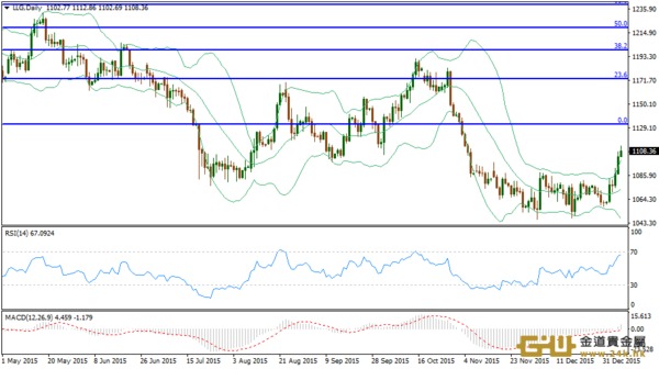 世界銀行下調2016年全球經濟增長預期,由3.3%下調至2.9%,並將中國經濟增長預期由7%下調至6.7%。市場對於中國經濟增長的擔憂加劇,離岸人民幣(cnh)兌美元大幅度下挫,全球股市暴跌,新興市場股市跌至2009年來的低位,新興市場等高風險資產和貨幣將遭到拋售。資金涌入避險的黃金和日元等。受避險情緒的影響,金價打破1050-1100震盪區間,曾經試探1110/1112美元美元區域,確認曙光初現的訊號,上方阻力位在1115和1120。不過,避險情緒對市場影響短暫。在震盪過后,市場可能很快回復平靜。慎防在非農就業報告出爐前后,出現急速獲利了結的情況,下方支撐在1080美元。