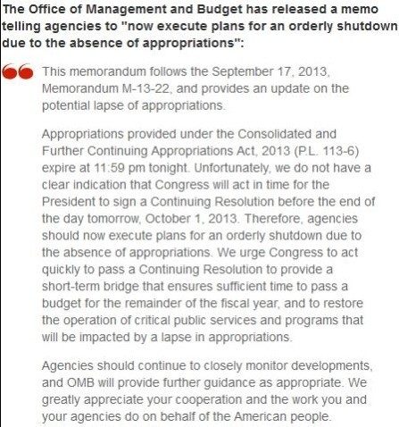 北京時間10月1日上午訊息 因美國兩黨就奧巴馬醫改分歧仍舊無法彌合,國會兩院沒有就新預算案達成一致,美國政府管理預算局(Office of Management and Budge)發布備忘錄,要求各部門開始執行有序關閉計劃。