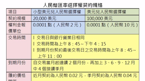期交所即將推出的2檔人民幣匯率選擇權,分別為契約規模2萬美元的「小型美元兌人民幣選擇權」及10萬美元的「美元兌人民幣選擇權」,皆採人民幣計價、現金結算,並分別以財團法人台北外匯市場發展基金會之臺灣離岸人民幣定盤匯率(臺灣CNT定盤價)及香港財資市場公會之美元兌人民幣即期匯率定盤價(香港CNH定盤價)作為最後結算價。交易時間為銀行營業日上午8點45分至下午4點15分,完整涵蓋臺灣外匯現貨市場交易時段,提供交易人依現貨市場狀況即時從事交易的機會。