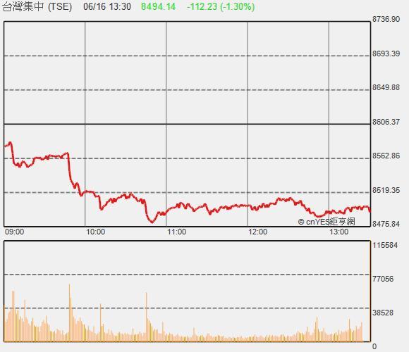 英國脫歐機率提高,加上市場預期下周理監事會降息機率提升,使得金融股成為台股領跌指標,包括蘋概股、高價股也跟進走弱,儘管漢微科因為併購題材強攻漲停,但指數依然開低走低,接連摜破8600點及8500點大關,終場下跌112.23點,以8494.14點作收,成交值695.36億元,將測試月線8486點及季線8481點支撐。
