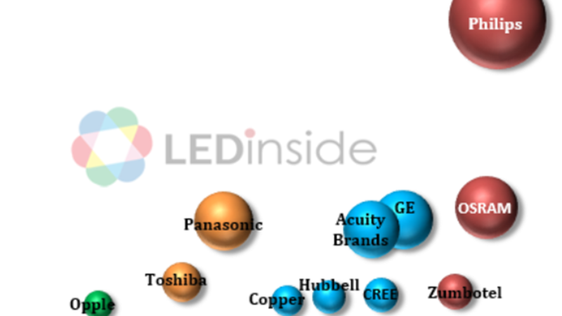 2015年全球照明品牌廠通用照明營收及市占率。(圖取自LEDinside)