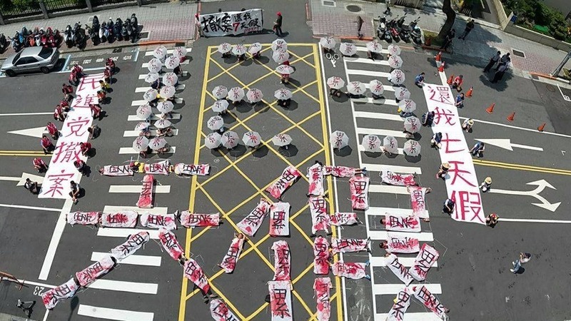 在立法院群賢樓外,聚集了超過百人,頂著烈日高溫下,有的拿著累的布條,躺在大馬路上,象徵「累癱了」,有的撐著寫著累的白傘,表示「累散了」,要凸顯,長期以來工人在台灣過勞的情況。