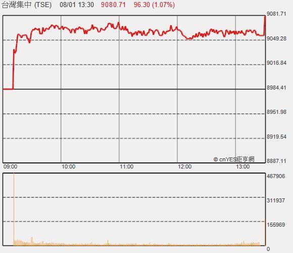 擺脫上周五黑K棒陰霾,台股今天在新台幣升值,台積電跳空開高激勵下,開盤就順利重新回到9000點之上,鴻海及華新集團股跟進助攻,指數持續走高,朝收復上周五高點9071點挺進,尾盤在面板雙虎、金融股,以及台積電收在最高點177元,終場大漲96.3點,以9080.71點作收,成交值則為775.4億元。