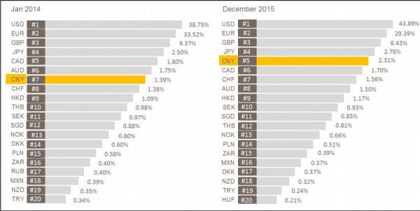 2015年12月人民幣在全球支付市場占有率升至2.31%,11月為2.28%。總體來看,12月以人民幣作為支付方式的總金額環比增長15.92%,而所有貨幣支付總金額環比增長14.43%。