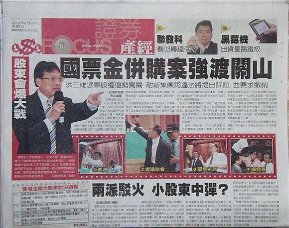 國票金控(2891)今天召開股東會,由於公司內部兩派人馬為購併外商大都會人壽,有嚴重分歧看法,導致雙方火爆登場,所有議案均以投票方式表決,購併大都會人壽案,也在洪三雄派的強勢股權數支持下強渡關山獲得通過,持反對意見的耐斯集團,認為這是違法議案,將提出訴訟,並要求撤銷對大都會人壽的購併案。