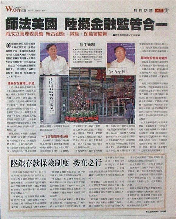 美國總統歐巴馬日前簽署金融改革法案,這是金融危機之後,美國金融監管走向一元化的重大轉折。大陸國務院的重要智囊透露,大陸也在研擬金融監管一元化的方案,將成立「中國金融監督管理委員會」,將目前多元分散於銀監會、證監會、保監會的權力,集中於一。
