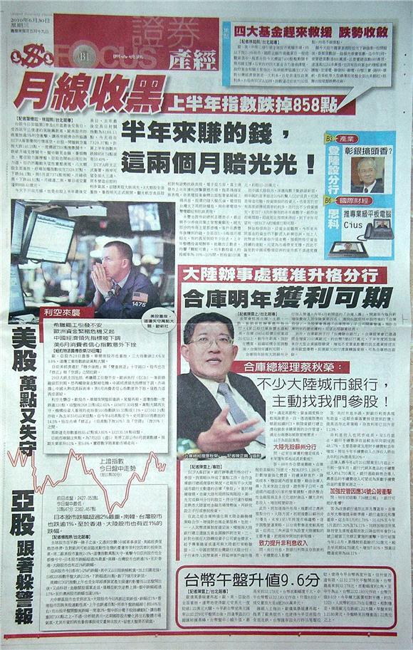 台股今日面臨第2季及6月底最後交易日,受西班牙公債違約風險飆新高,歐美股市昨晚重挫逾3%利空衝擊,讓兩岸經濟合作協議ECFA簽署慶祝行情落空,八大類股全面重挫,終場加權指數收在7329.37點,下跌94.2點,與5月底7374點相較,月線收黑,下跌44.61點,月線連二黑,單日成交量達到888.41億元。