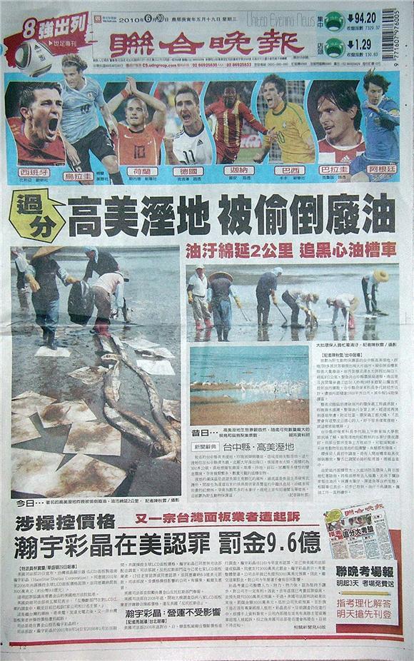 被劃為野生動物保護區的台中縣高美溼地,昨晚7時多被民眾發現出現大片油污,疑似被油槽車傾倒大量廢油,油污面積從清水大排到出海口,綿延約2公里,緊急向台中縣環保局通報,海巡署及民間環保義工近50人昨晚9時多趕緊以攔油索控制油污擴散,台中縣府保育科長李代娟初步估計,遭油污面積達1000平方公尺,其中有1/4是保護區。