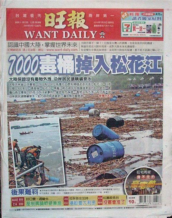 大陸吉林省山洪暴發,28日有7000只有毒化工原料桶隨波逐流進入松花江,目前只撈上400多只。事發後,松花江、黑龍江附近居民及俄國遠東區的伯力官民,都擔心再次爆發2005年江水汙染事件。當地官方保證,毒物沒有外洩,但仍有大批沿岸居民搶購礦泉水,伯力政府則派員到江邊加強水質檢測。