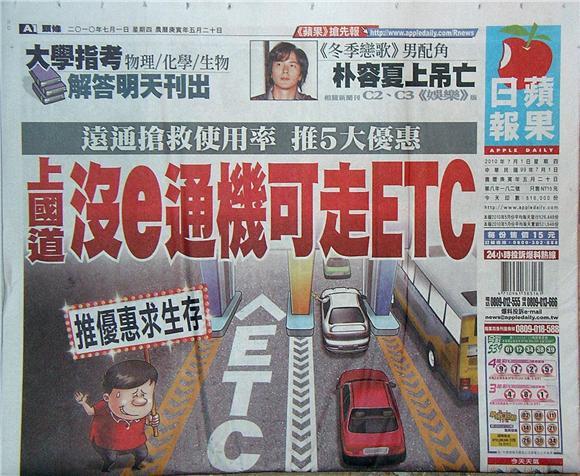 ◆蘋果日報:上國道 沒e通機可走ETC
