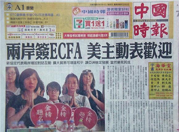 ◆中國時報:兩岸簽ECFA美主動表歡迎