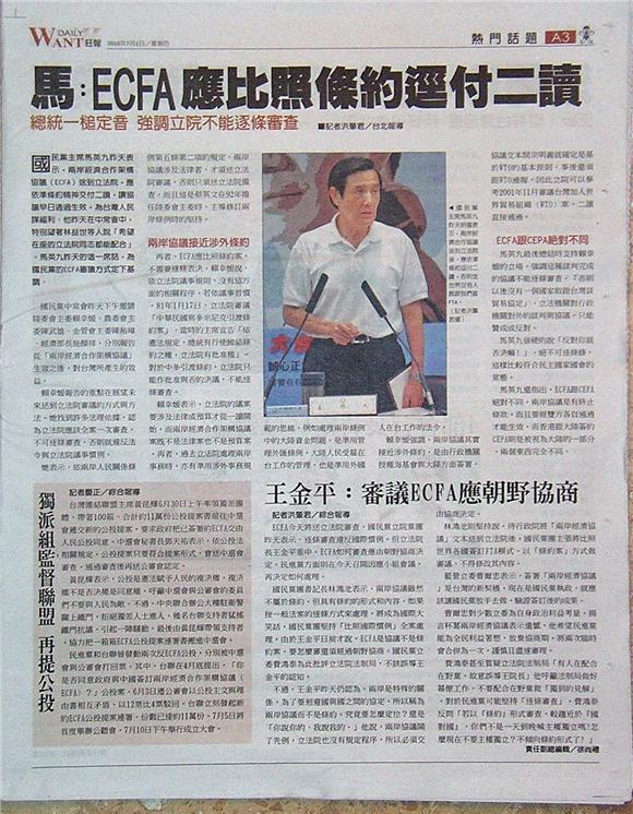 ■ECFA審議馬王不搭調 立院今審兩岸經濟合作架構協議