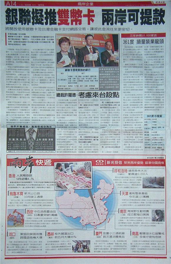 繼銀聯卡在台刷卡、提現後,中國銀聯將與台灣的銀行合作發行類似香港的「雙幣卡」,可在大陸領人民幣、在台領新台幣,並開放使用銀聯卡及台灣的金融卡支付網路交易,讓兩岸金流更密切、頻繁。